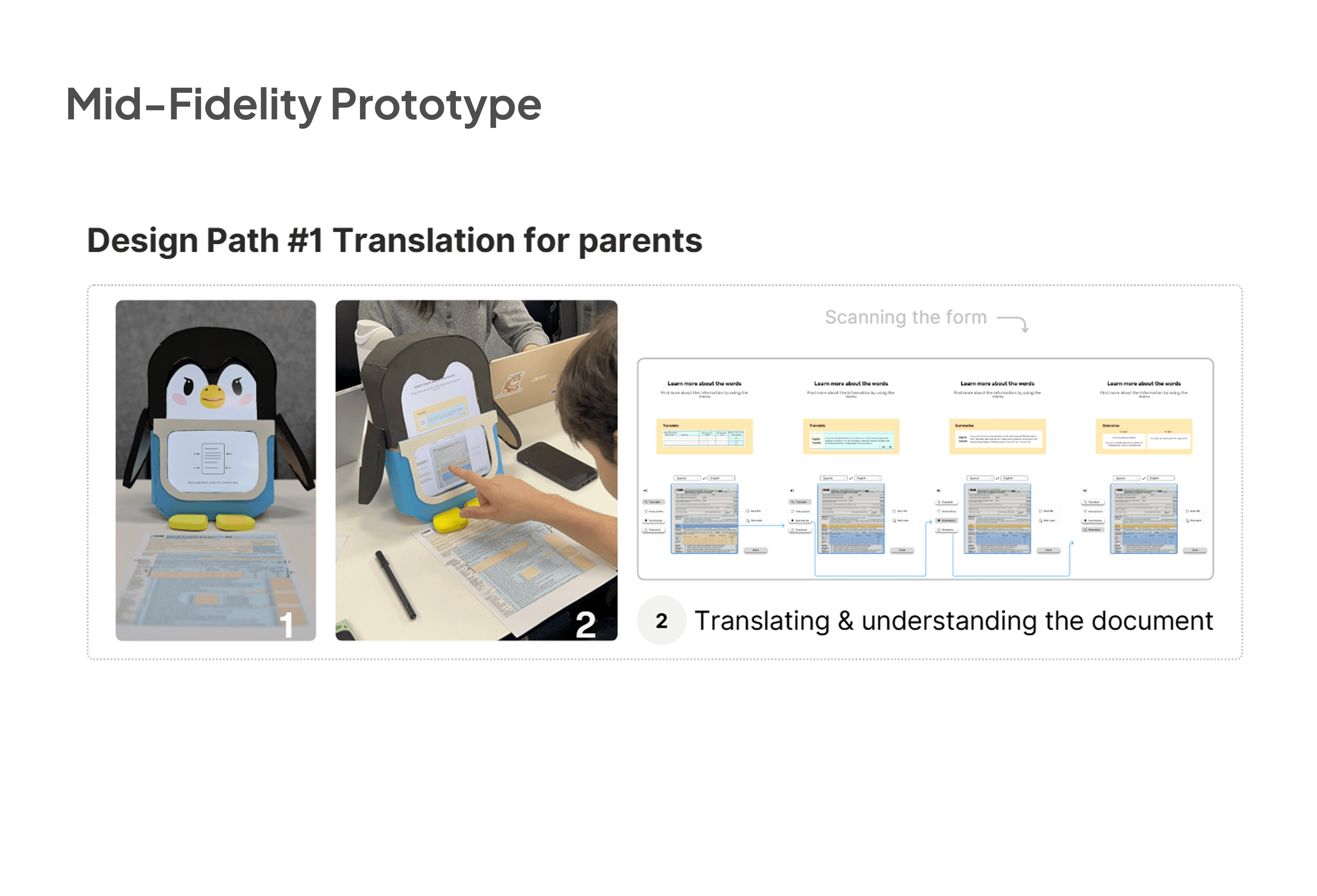 Using Figma and our arts and craft skills, we moved to iterating on a physical product, experimenting with different visual and informational hierarchy as well as the product's overall design. This step allowed us to refine how both the product and the UI pattern could best support these journeys, ultimately leading to the development of a primary user flow that effectively addressed key pain points.