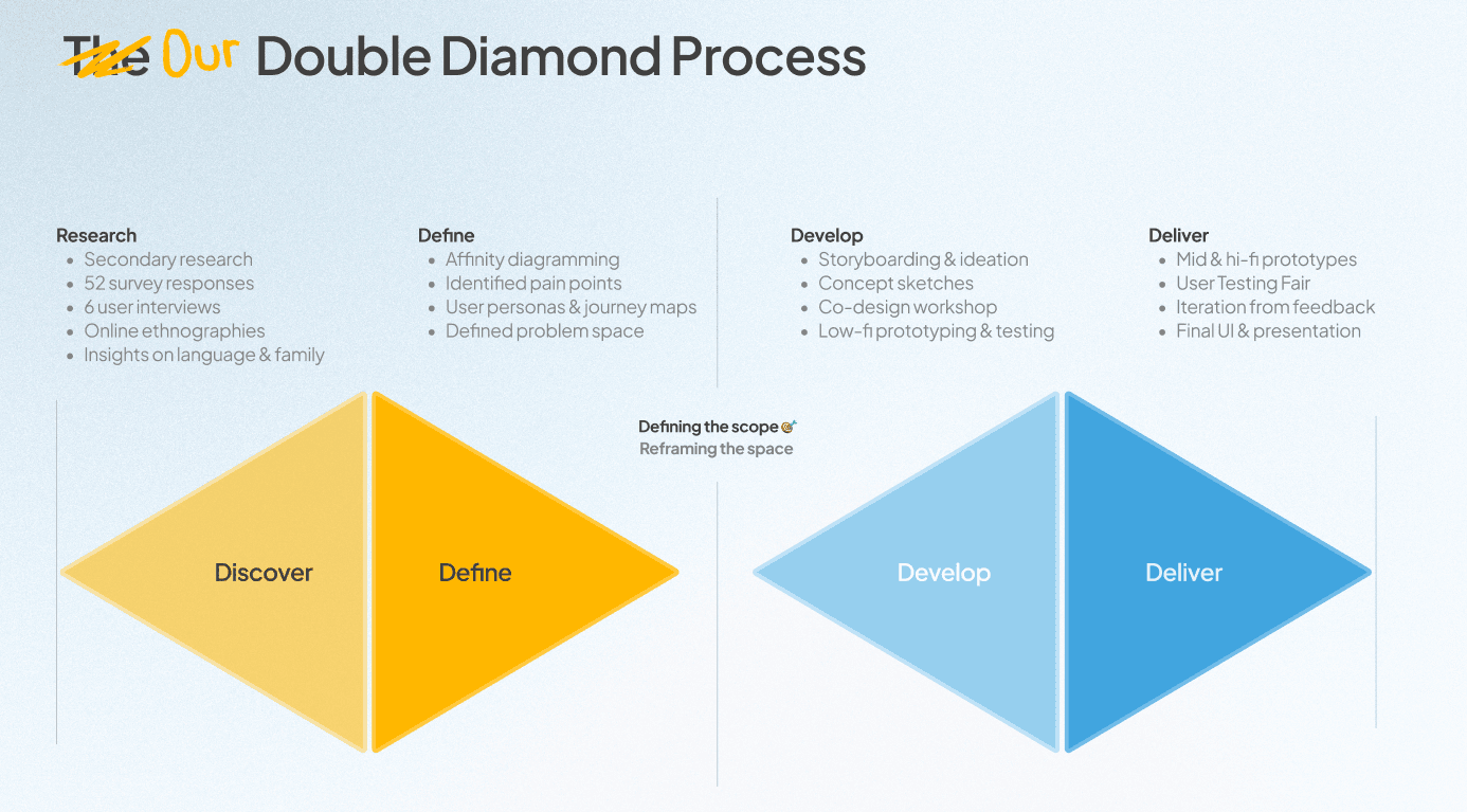 To design Kinori, we utilised our own version of the Double Diamond approach to design thinking, guiding our project from discovery and research through to ideation, refinement and finally the high-fidelity prototype.
