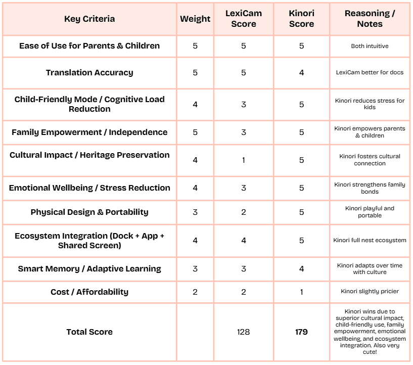 We used a Decision Matrix to assess each concepts based on a range of criteria that was best suited to meet the needs of our problem statement. Among the options, Concept One stood out amongst the rest as a result of its strong alignment to both user needs as well as the product design aspect.