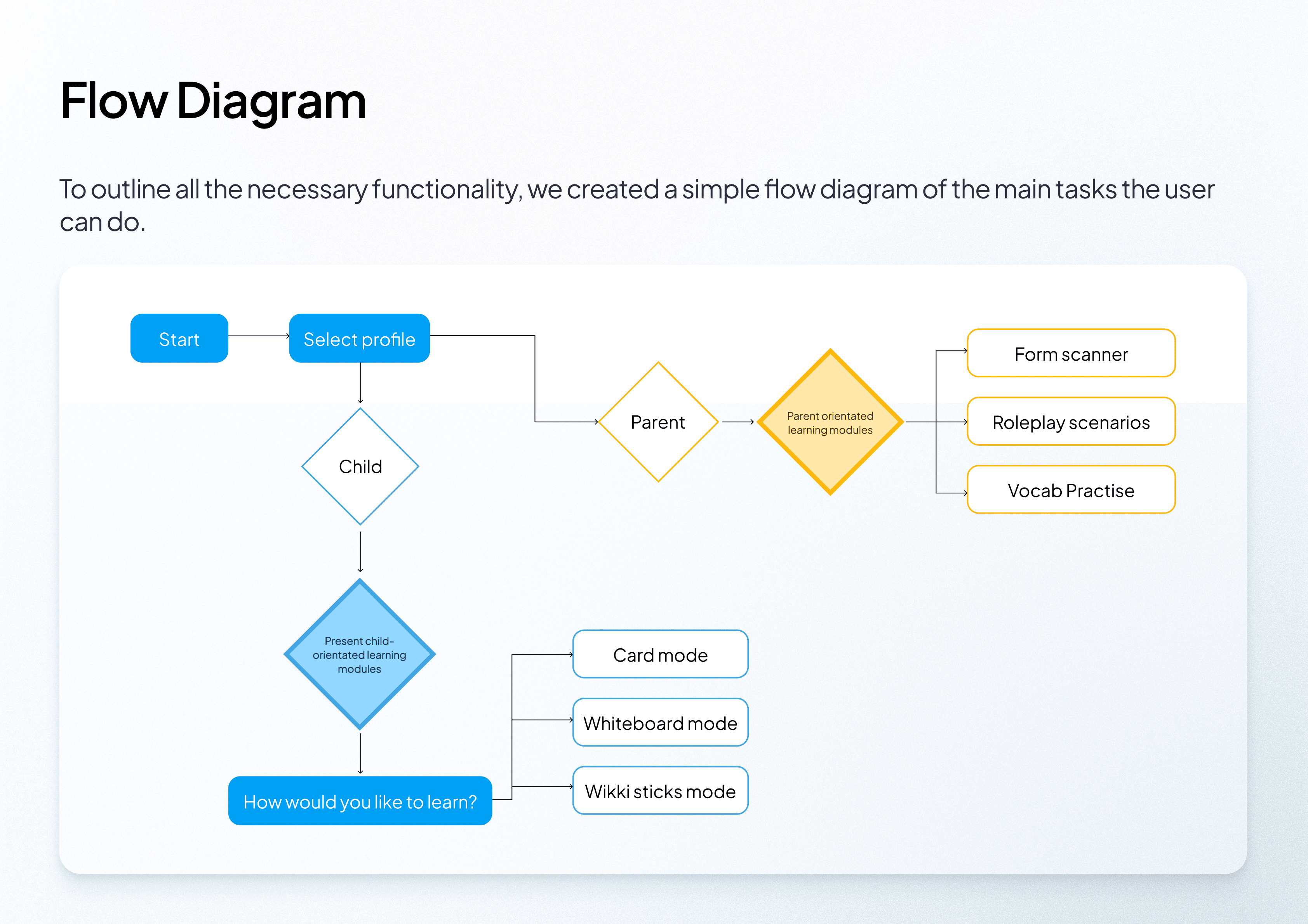 To help us better understand how Kinori would work through its screen-interface, we made user flow diagrams to ensure our designs were purpose-driven and aligned with user needs. To achieve this, we constructed distinct user flows that captured the key interactions and journeys users would take whilst using our prototype.