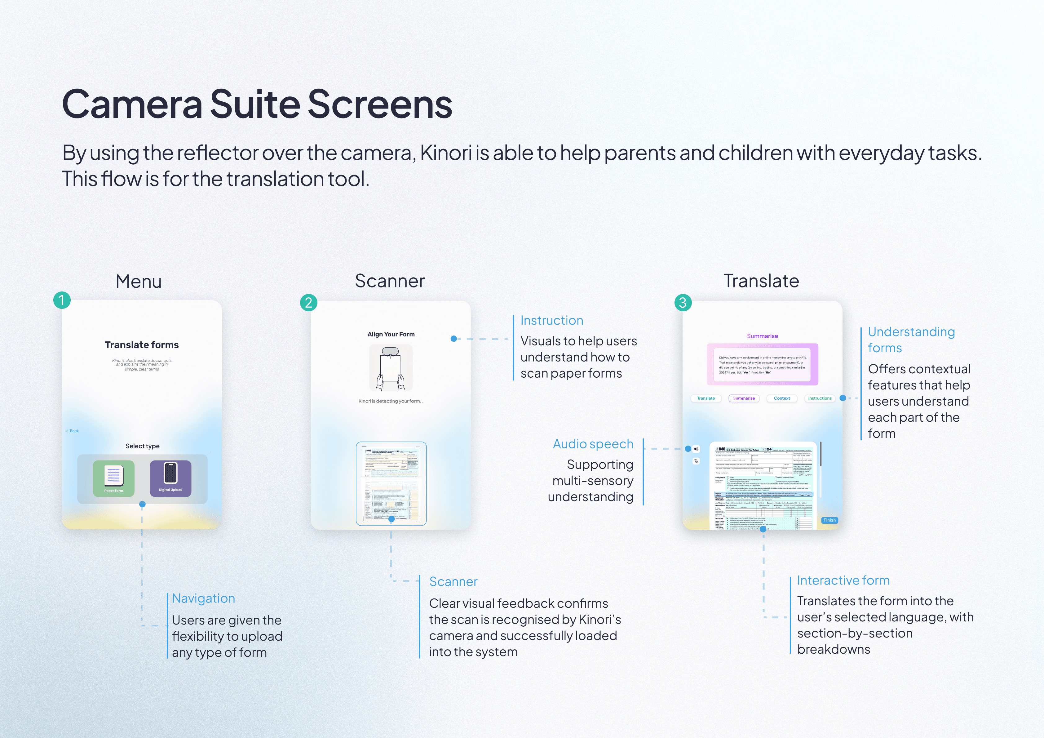 3️⃣Camera Suite Tools: With its camera, Kinori can view real-world tasks and offer instant support from translating documents to helping kids through homework.