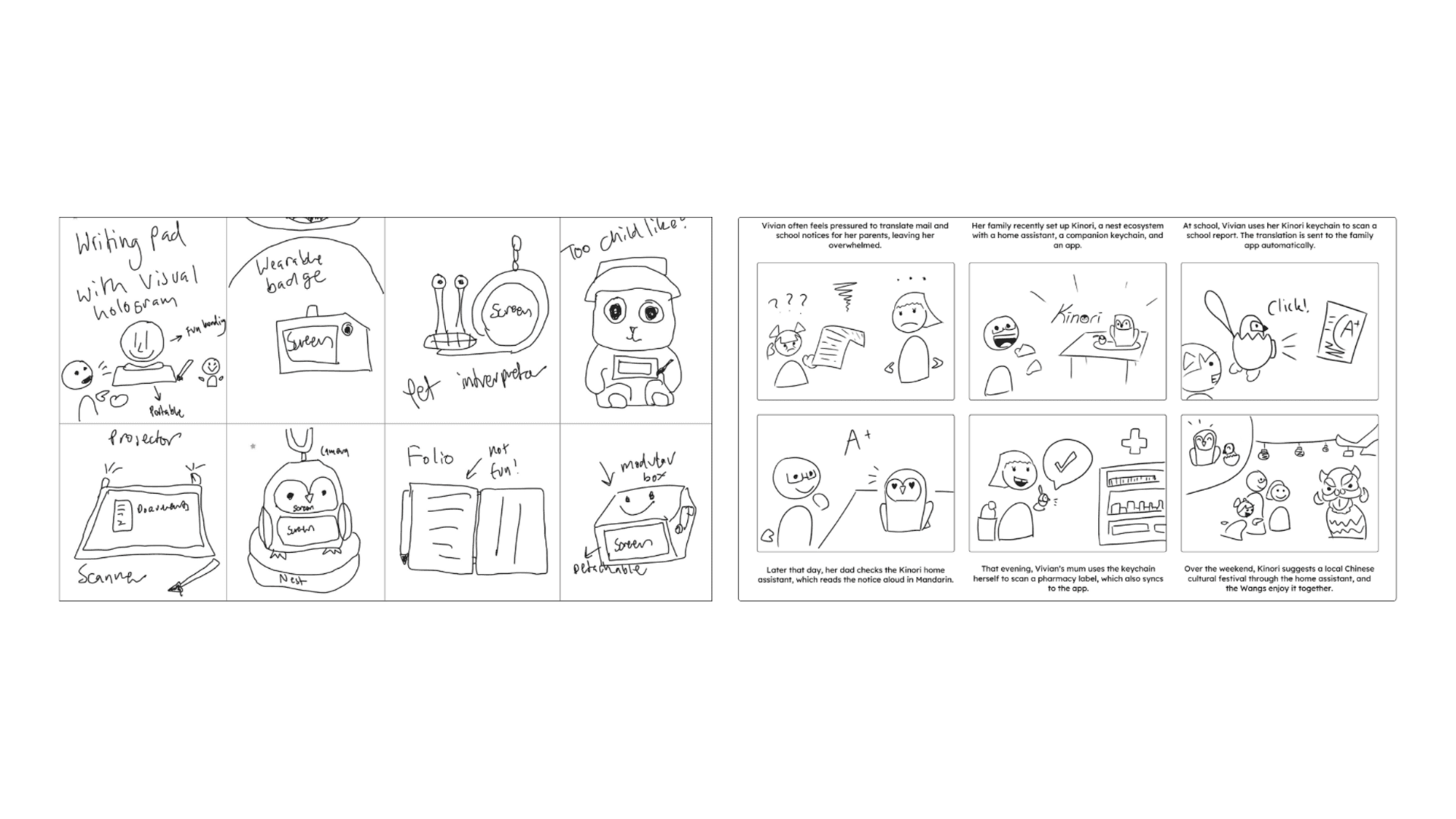 We began our prototyping process for Kinori with concept sketches as well as a storyboards on how the product will be used, this guided us on how we should further develop areas of the prototype through to our mid-fidelity wireframes.