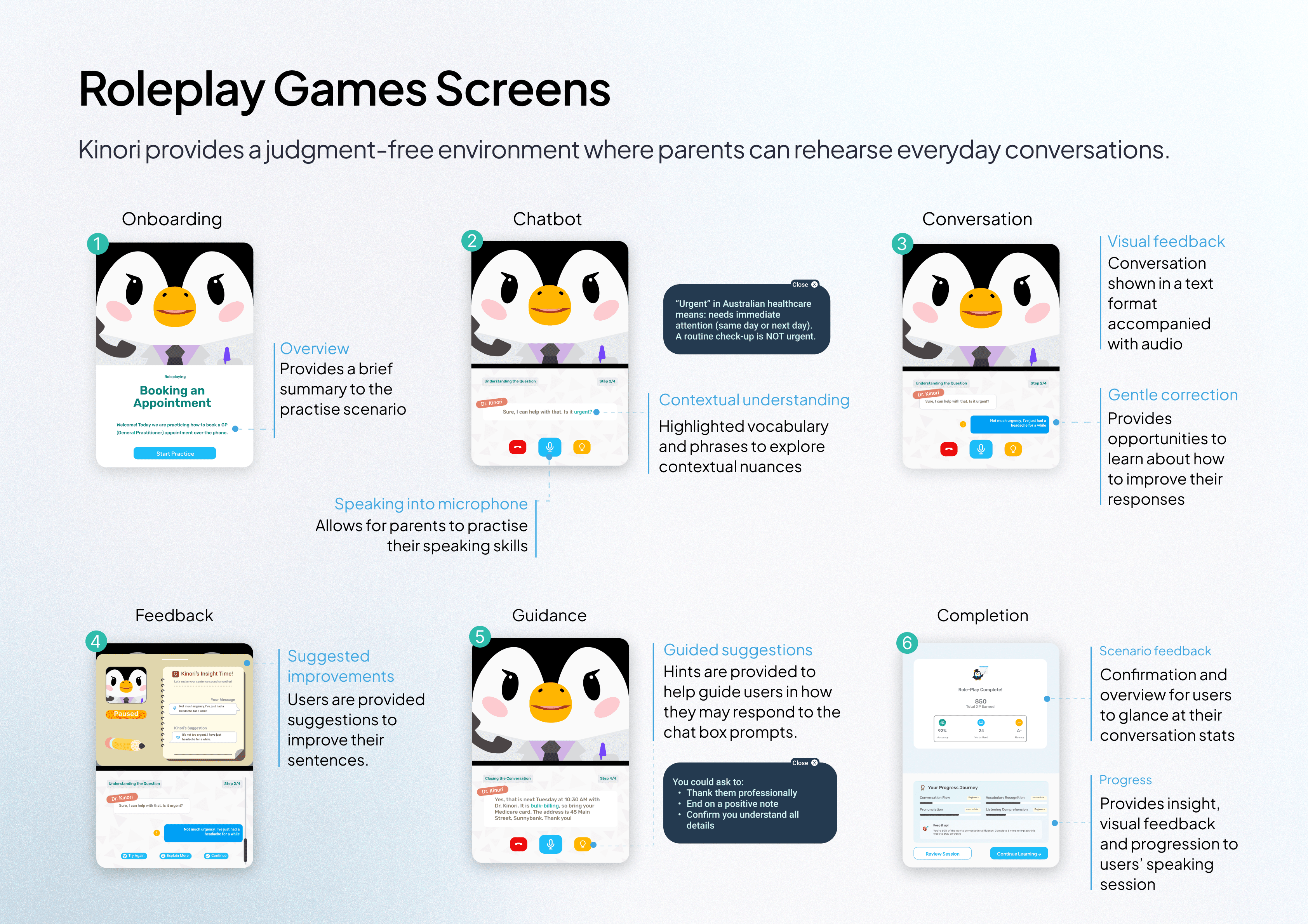 1️⃣Role-Play Games: Role-play games let parents practice real-life conversations by talking to Kinori through the microphone, without the pressure of real-world stakes.